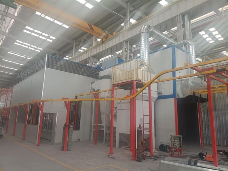 喷漆线:上喷淋前处理烘干脱水冷却—底漆—流平—面漆—流平—烘干(30min、80℃)—冷却—下件