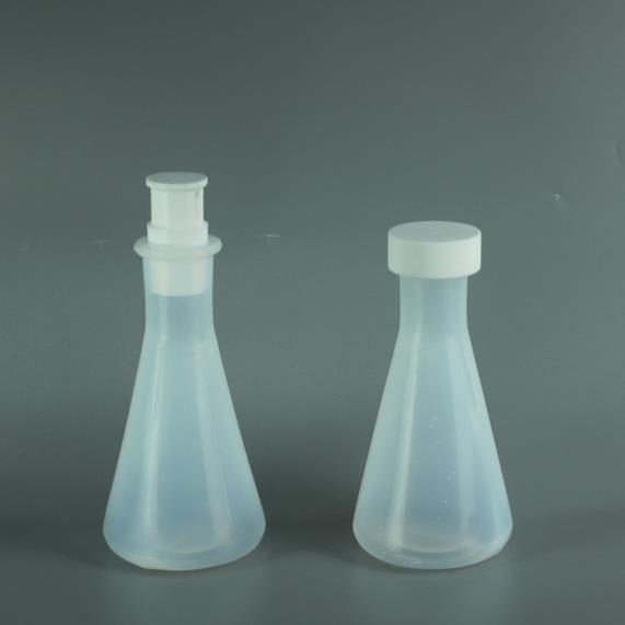 PFA三角烧瓶也称锥形瓶(也有PP等其他材质,使用相对较少),由特氟龙PFA材质制成,纵剖面呈三角形状的滴定反应器,一种化学实验室常见的PFA器皿。一般使用于滴定实验。为防止滴定液下滴时溅出,造成实验误差,将瓶子放磁搅拌器上。可用于普通实验,制取气体或作为反应容器。其锥形结构相对稳定,不易倾倒。比重大,并具有耐热性,因此可没入到水浴器或油浴器里进行加热。另外采用平底,稳定性好。由于是三角烧瓶,不需要烧瓶架也是一个优点。