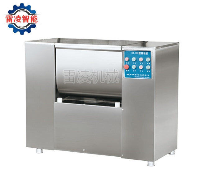 拌馅机(食品加工机械厂家Tel:186*1508-5507)主要用于搅拌馅状物料,也可用于其它散状物料粉状,酱状物品的搅拌和混合。拌馅机是用与混料的理想设备,效率高,便于操作,是制作风干肠类产品、料状泥状混合肠类产品、丸类产品的理想设备,同时也是生产水饺、馄饨类面食产品的可选设备。