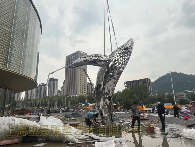 温州宝龙广场鱼雕塑 镂空鲸鱼不锈钢雕塑安装不锈钢鲸鱼镂空菱形一跃而起的造型制作,镜面效果光可照人,鱼形象而生动,已安装在浙江省温州市宝龙广场,给整个广场增添一份别样的景致,很受人们的喜爱。