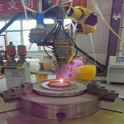 八轴联动激光熔覆设备,是国盛激光自主研发的以机器人为运动核心,可适应各种复杂结构,和非标准零件的激光熔覆加工系统。该系统配置灵活多样,根据客户应用场景可配置不同规格的机器人,同时选配变位机、转台、滑台以适应不同加工类型工件的激光熔覆加工及表面处理。设备主要由前端执行机构和后端设备组成,前端执行机构包括机械臂、变位机、电气控制系统、激光熔覆头、熔覆喷嘴组成;后端设备包括熔覆专用激光器、熔覆专用水冷机、稳压电源、送粉器等。