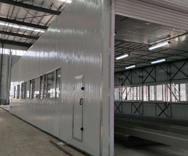 一种是侧进风(或房顶部)、侧排风。这种排风设计管道在房体之外,长度与整体移动房体的行程相同。外侧排风管道上设若干个电动风阀,而在房体侧面设置若干个喷漆或打磨工位,并在此处通过伸缩汽缸实现与排风管道的自动对接。漆雾收集采用玻纤地棉过滤,过滤棉框嵌入喷漆房墙体的排风一侧,而另一侧墙体或者房顶设置进风过滤系统。