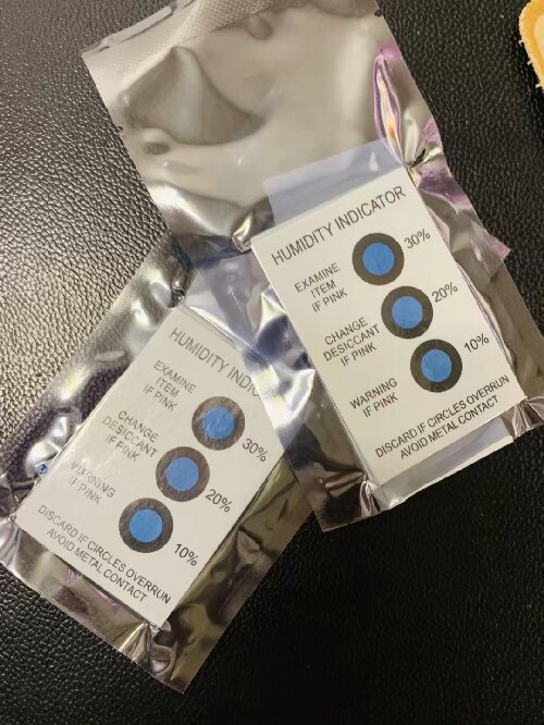 原理湿度指示卡可以很方便地检测出密闭包装里的相对湿度,是一种便捷而廉价的检测环境中的湿度是安全的方法。使用者可以通过卡片上面的颜色的变化迅速判断产品包装内环境温度情况及干燥剂的使用状况。如果包装中的湿度到了或者曾经到过该湿度值的话,卡片上的点就会从蓝色变成粉红色。可以估算出干燥剂的使用功效,以便及时更换干燥剂。使用湿度指示卡产品,可以使您的产品特别是一些精密的产品免去受潮的危险。