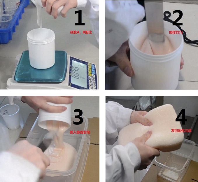 首先将发泡硅胶的A组分、B组分单独搅拌匀,防止长时间存放出现的材料沉淀导致发泡不充分。然后按1:1的重量比例在操作容器中进行混合搅拌匀,注意必须使用电子称!操作好后即可进行浇注填充。