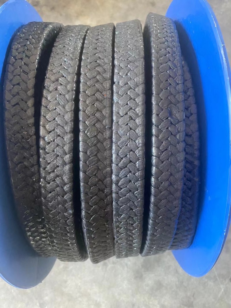 以柔性石墨线为基础材料,利用高速金属丝编织设备,在石墨线的外表面均匀包裹一层茵苛镍丝金属丝网。主要作为高温高压泵阀类盘根编织线使用。