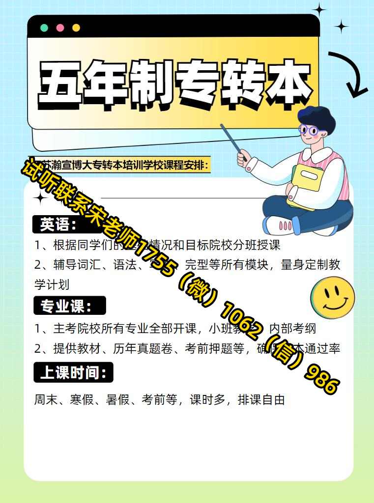 江苏瀚宣博大专转本学校是专业的五年制专转本培训机构,16年教学辅导经验,师资强,内部资料详细准确,严格的上下课打卡制度,提高学员上课的积极性和主动性,针对性全科辅导五年制专转本英语及汽车服务工程、市场营销等其他所有主考院校招生专业考试科目,英语先打基础再提优拔高,辅导词汇、语法、阅读、完型、写作等各个模块,开设不同基础层次班,根据考生基础情况分班授课;专业课全部小班教学,主考院校合作攻略,提前获取专业课精准考纲,按照考试的重点及难点进行针对性辅导和查漏补缺,让考生备考的针对性更强,效率更高,具体课程详情及预约试听课联系宋老师1755(微)1062(信)986了解。