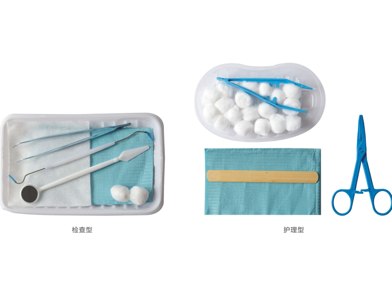 检查型: 由基本组件一次性使用口腔镜、镊子、牙探针,可选组件医用棉球、一次性使用治疗巾、医用脱脂纱布块、一次性使用吸唾管、一次性使用填充器、一次性使用医用橡胶检查手套、一次性使用聚乙烯检查手套、包布、物品盒组成。