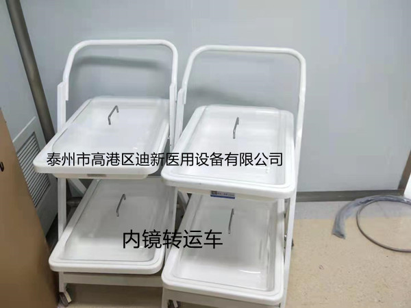 内镜转运车其周转箱材料亦由制造清洗槽台面的高分子复合材料独立开模制成,车体由不锈钢喷塑而成,具有耐腐蚀、不沾水、车行顺畅、取放方便等优点。盆内内镜存放导航隔条使污染部位和非污染部位分离。多层设计使客户在使用过程中可将清洁和污染的内镜分层标明后置放,避免交叉感染等功能