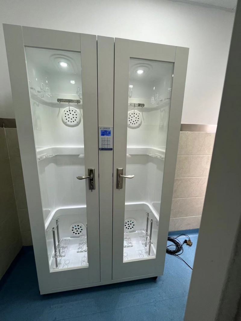 功能特点:内胆采用进口高分子复合材料独立开模一体成型,易清洁,表面细菌残留量低;使用方便、安全、快捷;对内镜无磨损等特性。外部材料采用多工艺处理的钢塑材料。与内胆有机的融为一体,柜内空间密闭效果优异,整体简洁、实用、美观、大方。内设智能化自动控制紫外线循环风消毒程序。消毒工作自动累时、照明和干燥等功能。共8种消毒模式供医院自由选择和设定。软镜柜内设计有透明PMMA制成的内镜悬挂系统,该系统为上中下三件套,防止相互碰撞,并且下部件为可升降式,适应不同尺寸的内镜的存放需要,严格按照《内镜清洗消毒技术操作规范(2004年版)第三章第二十六条中的“镜体应悬挂,弯角固定钮应置于自由位”的规定,保持内镜垂直存放,避免碰撞损伤,是现代内镜中心、手术室等科室必配设备。