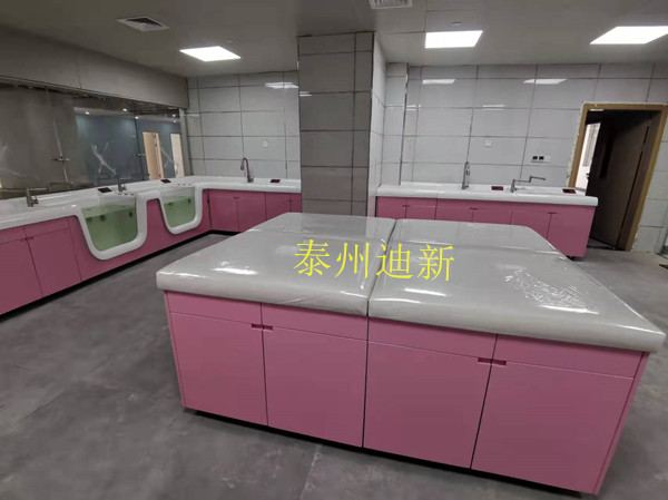 迪新婴儿洗浴中心拥有良好的台面质感,细腻亲切,无冰冷感,全弧形造型设计给婴儿体贴的呵护与关怀,洗礼池和游泳池特有的裙边设计,既方便固定一次性防交叉感染隔膜袋,又防止台面上污水流入池内。游泳池利用有效的水平面积提供更加理想的池内净深度,满足婴幼儿洗浴时的安全高度需要,同时有效保持水温特别设置水位线,防止婴儿游泳时池水外溢。