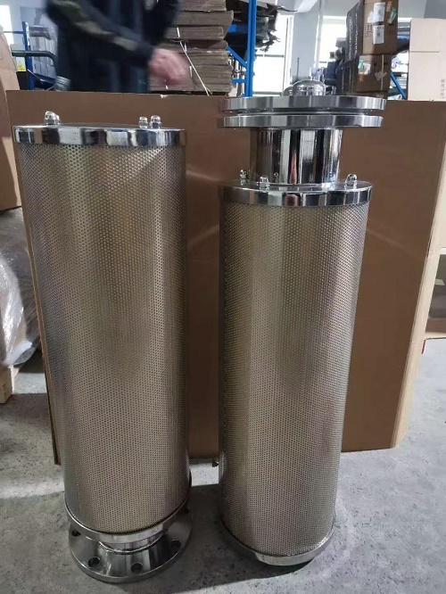 我公司消音器主要材料采用吸声频率性能好、耐温高的超细吸音玻璃棉为主体,以及美国的经特殊处理的消音滤材和其它材料组合而制成。通过消音器可降低噪音30分贝以上,完全达到进口产品的相同效果。并带有旁通安全阀,开启压力为2.0~2.2kgf/m2。当旁通安全阀打开,则必须更换消音过滤器的材料才能继续使用。该系列产品适宜于1.0MPa工作压力的吸干机配套。