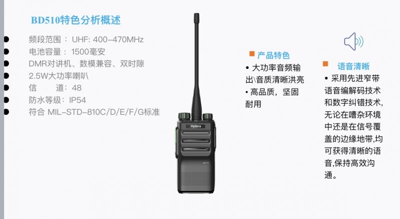 海能达 BP510 支持数字和模拟两种模式,采用3W大功率扬声器,内置专业降噪算法,即使在喧嚣的环境中也能接收清晰的音频。16小时标准续航,并支持方便快捷的USB充电,随时随地投入工作。轻薄便携,并支持外观和颜色定制,充分满足您个性化的需求。